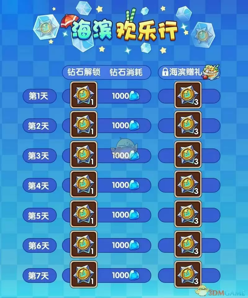 活动期间,海滨欢乐行将每天解锁一份礼物,大家可消耗钻石进行购买。若购买海滨赠礼,还可解锁海滨欢乐行的额外奖励!
