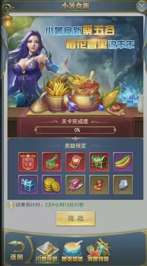 通关攻略:该活动通关非常简单,仅需将第一关里的所有怪物击败,收集五谷之灵,然后去找阿银,将五谷之灵按正确的顺序放置到南东中西北五个孔位中,即可。放置正确的孔位可以提升祭谷等级,等级越高战斗增益越强,如果是氪金玩家根本不用在乎,随便放就可以了,放置完五谷之灵,就可以开启第二关,第二关直接无脑打怪就可以。