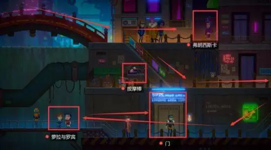 沿下图路线一路走来,拿到垃圾堆上的【按摩棒】(恶趣味~),最底层向左走会遇见之前的两个小孩,萝拉和罗宾,萝拉会把你被偷的包还给你,这样就拿回了白色通行卡。然后从右边写有“卯区”的白门进入。