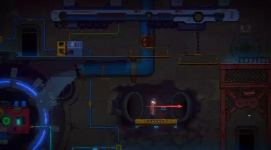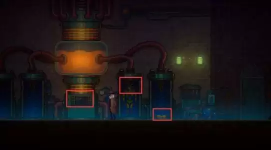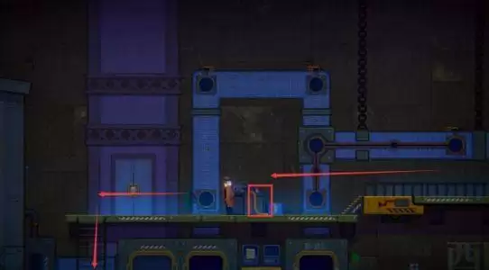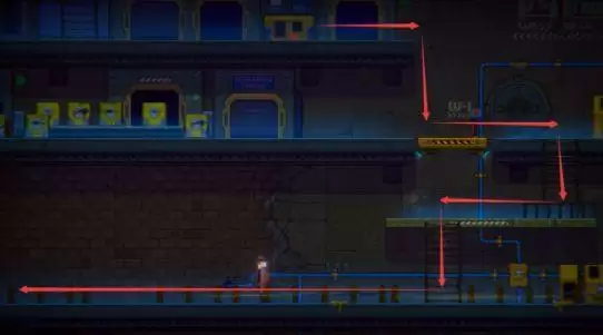 我们沿下图箭头一路向下,沿着凝结液的痕迹到最左边,发现有墙里有一个暗门,需要把电力引到这里才能打开。