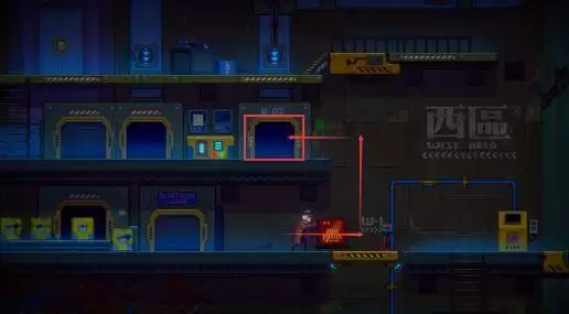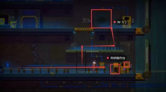 一条是沿下图往上爬两层进入W-1的管道门,进来之后,再进入E-1门(这些门旁边的墙上都会写上它们的编号,不要再说你找不到门了),按之前的路线回到维修车间旁。
