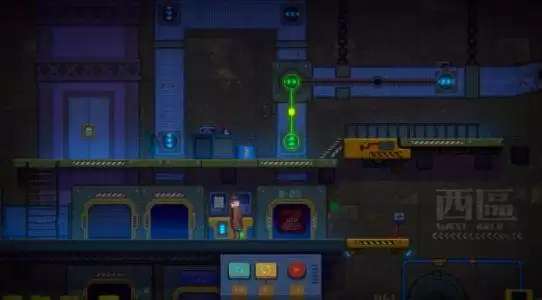 一路往下,按下图转动水车下方的电分流器,使电路与下图中的一致。然后到右侧,按下升降台的红色按钮,升降台浮起。