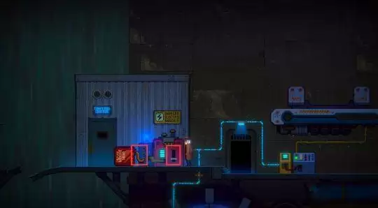 将路线调成下图样子,拉下拉杆,把箱子通过传送带发射到刚才的屋子门口。