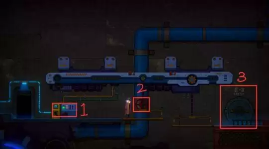 电流接通后,启动下图的控制台【1】,升降台会抬起,把升降台上的红色阀门【2】转动,引出水流。可以顺路进入最右侧【3】的E-3门中获得【遗落的机器人笔记】。