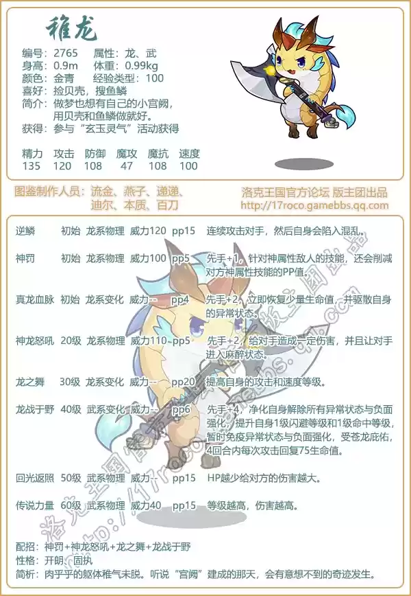 洛克王国稚龙通过【玄玉灵气】活动获得,技能配招推荐:神罚+神龙怒吼+龙之舞+龙战于野。性格推荐:开朗、固执。