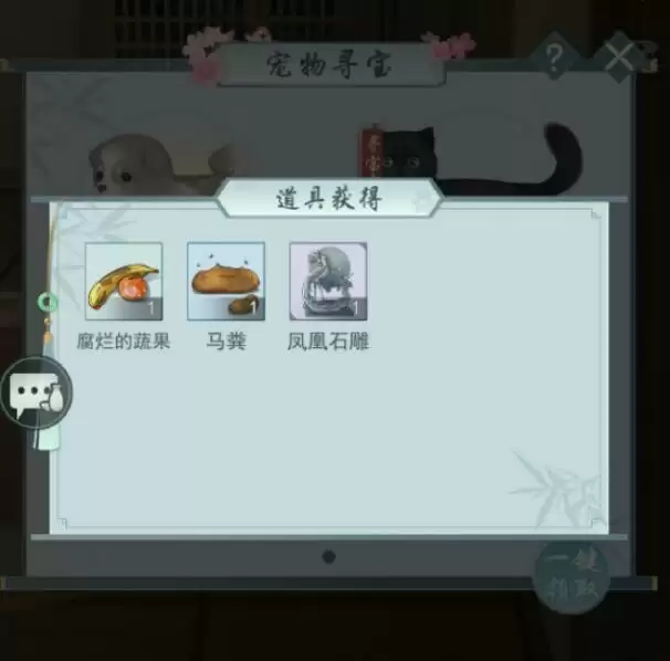 寻宝道具种类有:鱼,禽肉,畜肉,夹子,马粪,香蕉皮,各种水和不同品质的亲密度道具。每次寻宝带回的道具会从上述的道具中随机带回,其中水应该是鸭子专属道具了。也就是说运气好几个格子都可能是亲密度道具,运气差可能都是马粪。