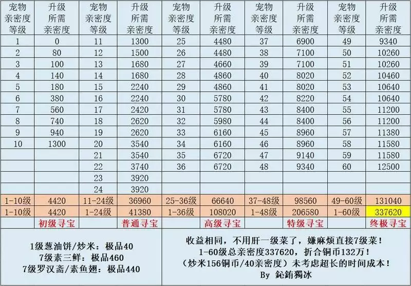 其实60级的终极寻宝并不划算,如果想喂到这个等级大概需要130万铜钱的食物,还有大量的时间(我一个多月的菜地全都贡献给了宠物)。