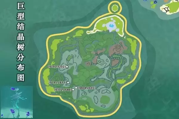1、如上图所示就是巨型结晶树位置分布图了,坐标位置有:9193.3202、9195.2813、9332.2646、9408.2695。