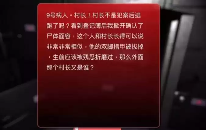 9号病人。村长!村长不是犯案后逃跑了吗?看到登记簿后我掀开确认了尸体面容,这个人和村长长得可以说非常非常相似,他的双脚指甲被拔掉,生前应该被残忍折磨过,那么外面那个村长又是谁?