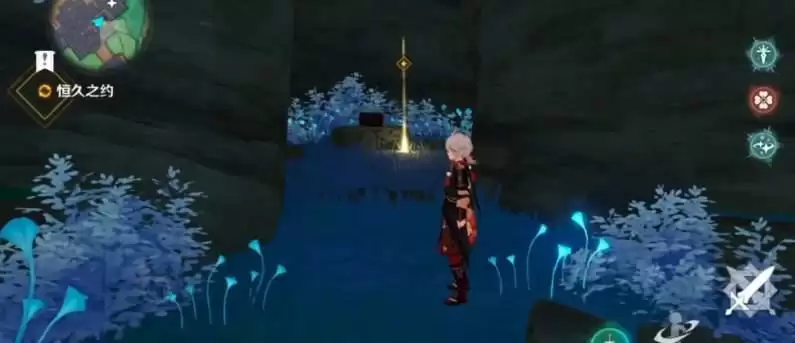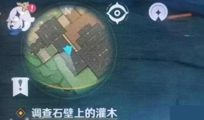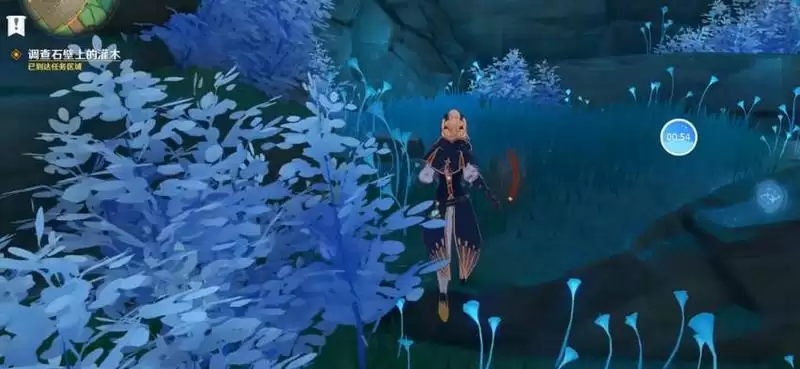 恒久之约任务首先需要调查石壁上的灌木,也就是山洞石墙上这些蓝色的植物,靠近后可以调查石壁进行互动。
