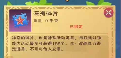 3、这个深海碎片每天只能最多获得188个,而且不能交易哦,为绑定道具。