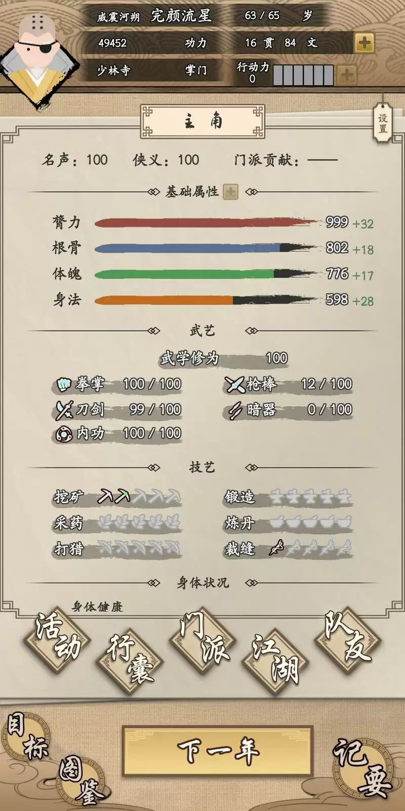 3.提升武功上限不要急,少林的话按着剧情走到了时间自动提升,其实好像就是学会一个武功就加10点,因为只能学10种,上限100点。