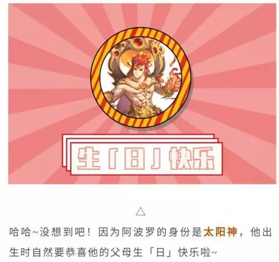 哈哈~没想到吧!因为阿波罗的身份是太阳神,他出生时自然要恭喜他的父母生「日」快乐啦~