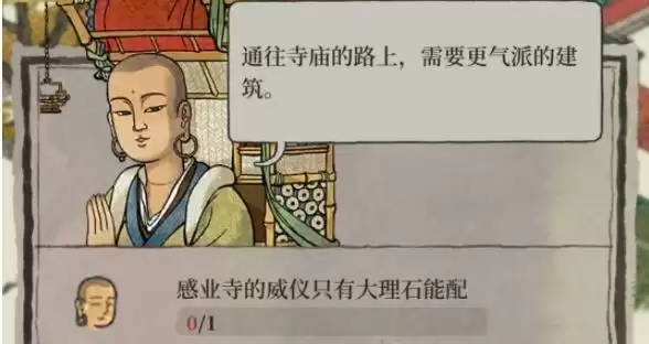 这里的提示是感业寺的威仪只有大理石能配,玩家们需要安置一个大理石牌坊就可以了,放在寺前面就完成任务了!