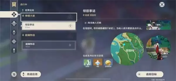 在绀田村寻找被隐藏的「秘密」,分别与老婆婆「柴门惠理」、小女孩「双叶」、小男孩「小猛」交谈,获取摩拉袋、货物袋、货物清单任务物品,提交给村长。