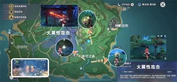 与【五百藏】交谈,陪3只里面玩,就是找到3只会发光的狸猫,会闪现跑,最后会变成可点燃的木架子,用火元素攻击即可。第二只在两个石头那,小的那个石头上,点调查才会出现。