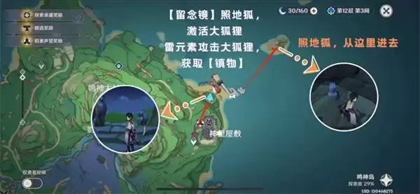 使用【留念镜】,照【地狐】,才会出现【雷樱旁枝】,携带雷种子进入屏障,还是照地狐,然后用雷元素攻击大狐狸。获得卷形的【镇物】。