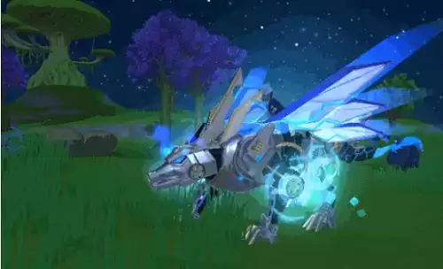 4、待进化至迅狼号·星翼背上两侧增加星翼组件获得飞行功能可在空中平缓滑行前进双眸投射出迅狼号的实时数据图,以检测状态腿部的护甲组件升级为浮游式增加迅狼号的推动力。