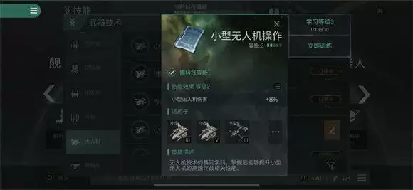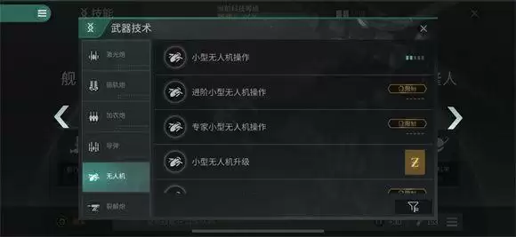 由于我们需要将无人机作为主要的输出手段,所以在武器技术板块,我们需要优先升级无人机。通过提升这一板块各种的技能,能非常有效的提升无人机的伤害和无人机防御。这就能保障我们可以用无人机打出足额的伤害。