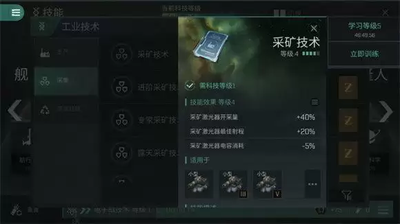 如果你不是一个战争分子,更大的爱好是遨游宇宙,开采矿石。武器技术的优先级就可以略微的往后放一放,优先学习导航学让我们有更强的机动能力,方便我们快速到达目标地点。同时较强的机动能力也能让我们遇到危险第一时间开溜。同时因为要采矿的缘故,采矿技术这一系列的技能也是必须要学习的,这样才能帮助我们开采到更多的资源。