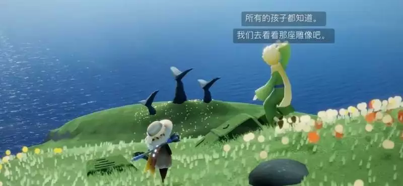 2、按照任务提示来到圣岛编钟,在编钟上找到小王子并与其对话,触发剧情,跟随小王子前往鱼尾雕像处;