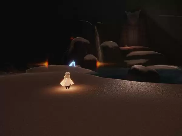 3、点燃水先知开始飞行追随足迹,在预言山谷转一圈即可拿到深呼吸动作。