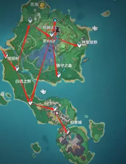 这是稻妻城所有地方,稻妻主线任务可以暂时放一下,先从下面指定的地方开图