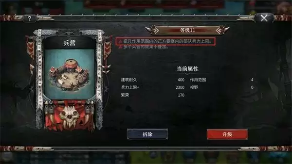 建筑物虽然都是独立建造的,但他们之间是有联动的,例如兵营会提升作用范围内要塞的部队的兵力上限,在游戏的前中期,几百的兵力上限很有可能会影响战斗的成败!