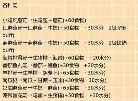 烹饪食物首先就需要有个烹饪锅,准备好锅之后就可以按照配方进行烹饪了。(食物配方有点多大家可以按ctrl+f查找自己想要的食物配方)