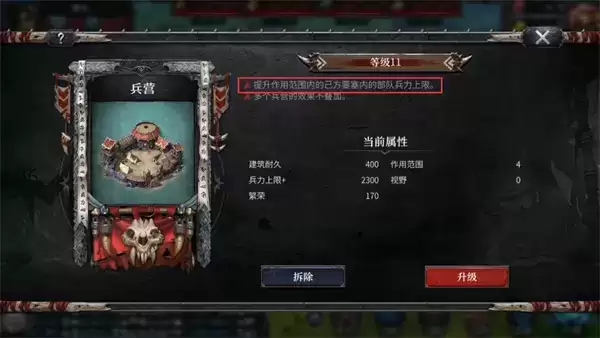 建筑物虽然都是独立建造,但他们之间存在联动。例如兵营会提升作用范围内要塞的部队的兵力上限,在游戏的前中期,几百的兵力上限很有可能会影响战斗的成败!