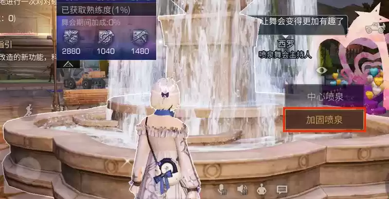 在舞会开始前,营地成员需要到喷泉旁加固喷泉,可以获得新币*400、营地贡献*30(每人每天只可以加固一次)。