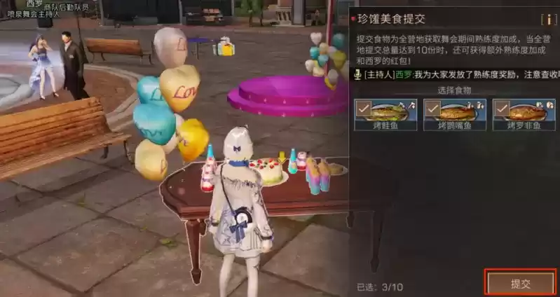 找到舞会的食物长桌点击提交美食(每人最多可以提交十次),即可获得新币*600、营地贡献*50(提交次数越多获得奖励会增加噢)