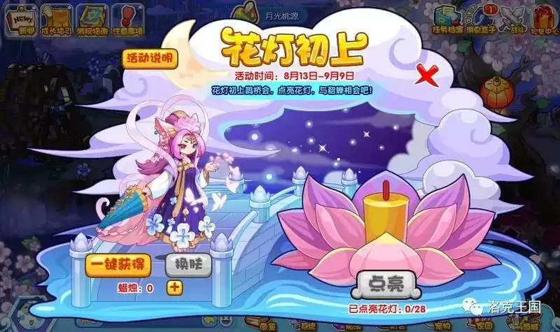 换肤方式需要点亮花灯达到一定次数才可激活,点亮花灯的前提是需要蜡烛,点击【+】可通过洛克钻换取蜡烛,每19洛克钻可换取1根蜡烛。