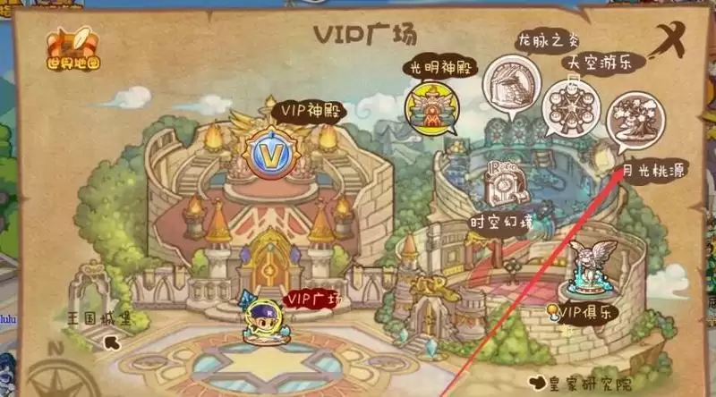 打开世界地图,点击VIP广场,之后打开小地图,点击月光桃源就可以进入了。
