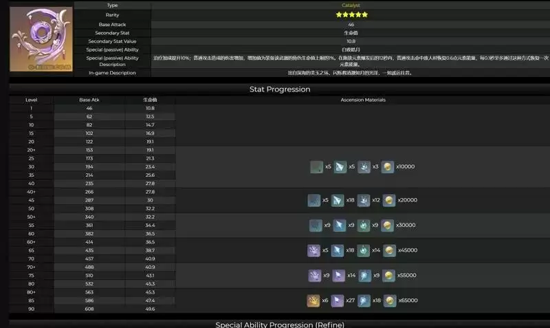普通攻击造成的伤害增加,增加值为装备该武器的角色生命值上限的1/1.5/2/2.5/3%。在施放元素爆发后的12秒内,普通攻击命中敌人时恢复0.6点元素能量,每0.1秒至多通过这种方式恢复一次元素能量。
