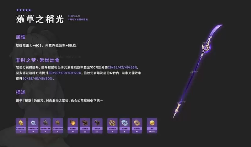 【薙草之稻光】2.1限定神铸赋形池抽取获得,属性(90级)词条:基础攻击力+608,元素充能效率55.1%。技能是:非时之梦·常世灶食。