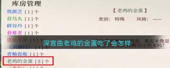 深宫曲游戏中老鸡的金蛋自己吃了没事,还会增加某些属性,但是如果作为礼物送给别的妃子,那么不仅可以涨对方的好感度,还能减少对方的某一项属性!