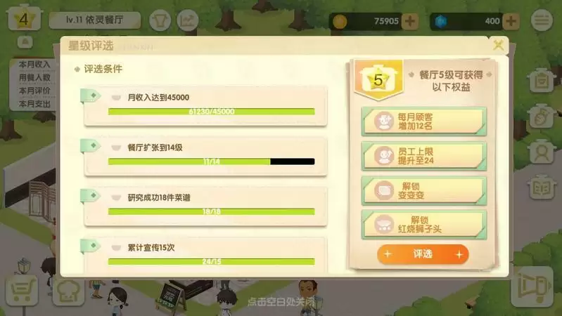 而点击左上角的五角星,完成里面的任务,便可以给餐厅升星。(见下图)