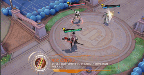 根据申公豹的血量以及战斗状态,会切换不同的指示灯,为自身和队友提供增益状态。处于脱战状态时切换为绿灯,处于战斗状态时切换为黄灯,处于低血量状态时会切换为红灯,红灯优先级最高。在指定地点召唤一个尖刺路障,并击退处于危险区的敌人。
