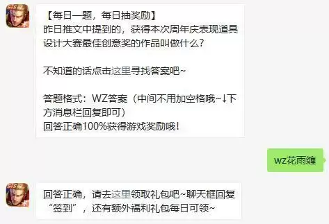 玩家对王者荣耀微信公众号进行关注之后,在公众号的右下角的“王者福利”,玩家可以点击一下“每日一题”。之后将会出现“每日一题”的问题,同时有提示:“wz+答案”回答问题即可;回答正确之后点击“这里”进入抽奖页面。点击”立即抽奖“即可抽取奖励!抽中奖励之后,系统会自动将奖品发放到游戏中哦!