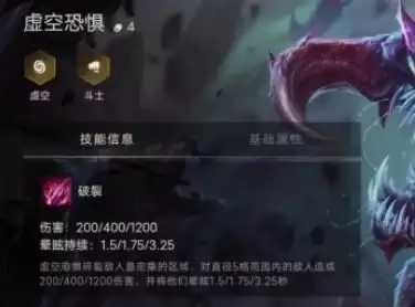 此外,羁绊的虚空能够提高他的真实伤害,斗士的话,能够有有效增加其血量增强肉度,-般来说虚空恐惧的第一 次技能 ,均能造成高伤害。