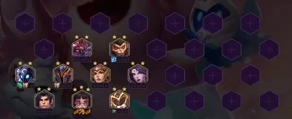 2、阵容组成:天罚弩神、驭影双生、虚空之女、星龙战神、曙光神将、虚空恐惧、不屈战神、齐天大圣、圣光战神(9人口完全成型,是围绕着天罚弩神来赌的赌狗阵容。)