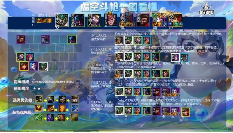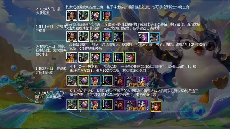连胜3-1直接跳6人口,如果没连胜,3-2上六人口,说明你没玩熟,有6斗士上6斗士,雷霆之主吃装备即可,没有就继续斗士搭换形师。