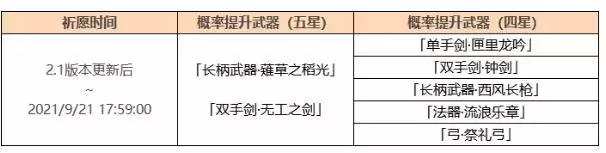 ● 活动期间,四星武器「单手剑·匣里龙吟」「双手剑·钟剑」「长柄武器·西风长枪」「法器·流浪乐章」「弓·祭礼弓」的祈愿获取概率将大幅提升!