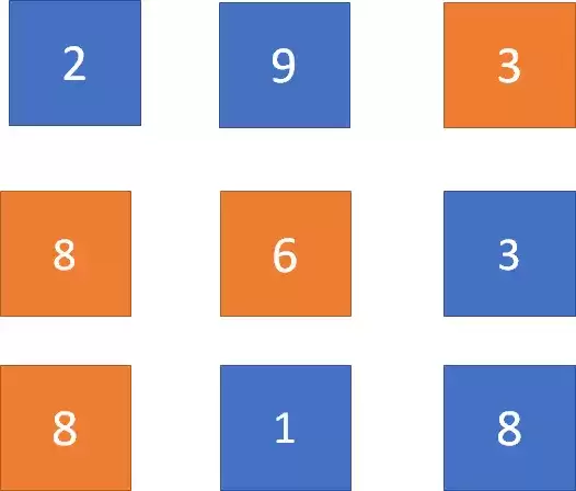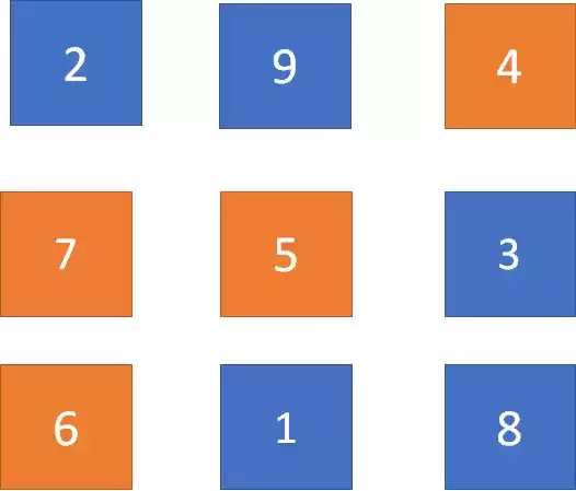 北=1,东=2,南=3,西=4,带石头=+4,空格=9。要求横竖斜之和都为同一个数字。