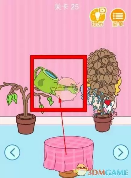 10、到中间场景用水壶给右边枯萎的绿植浇水,绿植复活长出西瓜,点击获取西瓜。