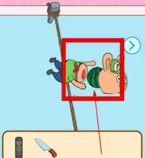 4、回到左边场景,这时候小兔子被绳子绊倒了,露出了里面的西瓜,拿起西瓜。