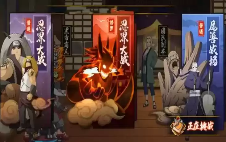 尾兽战场第一关挑战二位由木人,矢仓,老紫,汉,羽高,枫六大尾兽人柱力!难度应该不大,但对于原著的特色都有,比如矢仓副本设定机制是复制我方使用忍者。老紫身上带有火焰,会持续灼烧敌人。