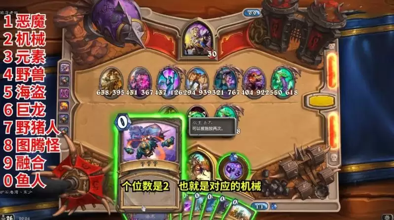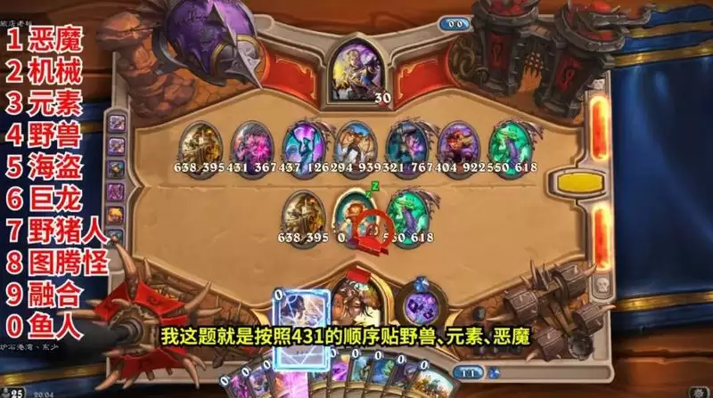 接着是计算范围内随从血量之和,然后取后三位数。继续以我这题举例:395+367+126+939+767+922+618=4134,取后三位数也就是134,然后找到1、3、4对应的种族牌,从个位数到百位数的顺序开始输入,我这题就是按照431的顺序贴野兽、元素、恶魔。