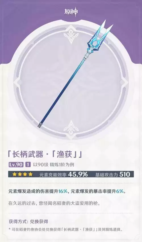 ◆可在稻妻钓鱼协会处兑换获得「长柄武器·「渔获」」及其精炼道具。